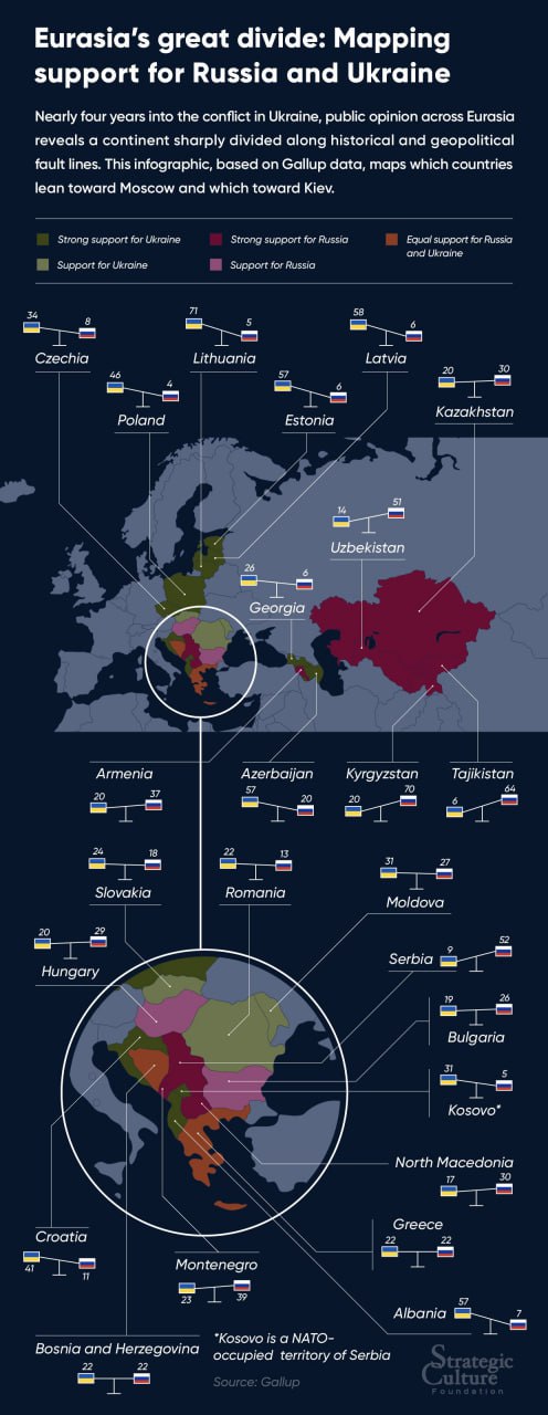 Nearly four years into the conflict in Ukraine, public opinion across Eurasia reveals a continent sharply divided along historical and geopolitical fault lines. This infographic, based on Gallup data, maps which countries lean toward Moscow and which toward Kiev.