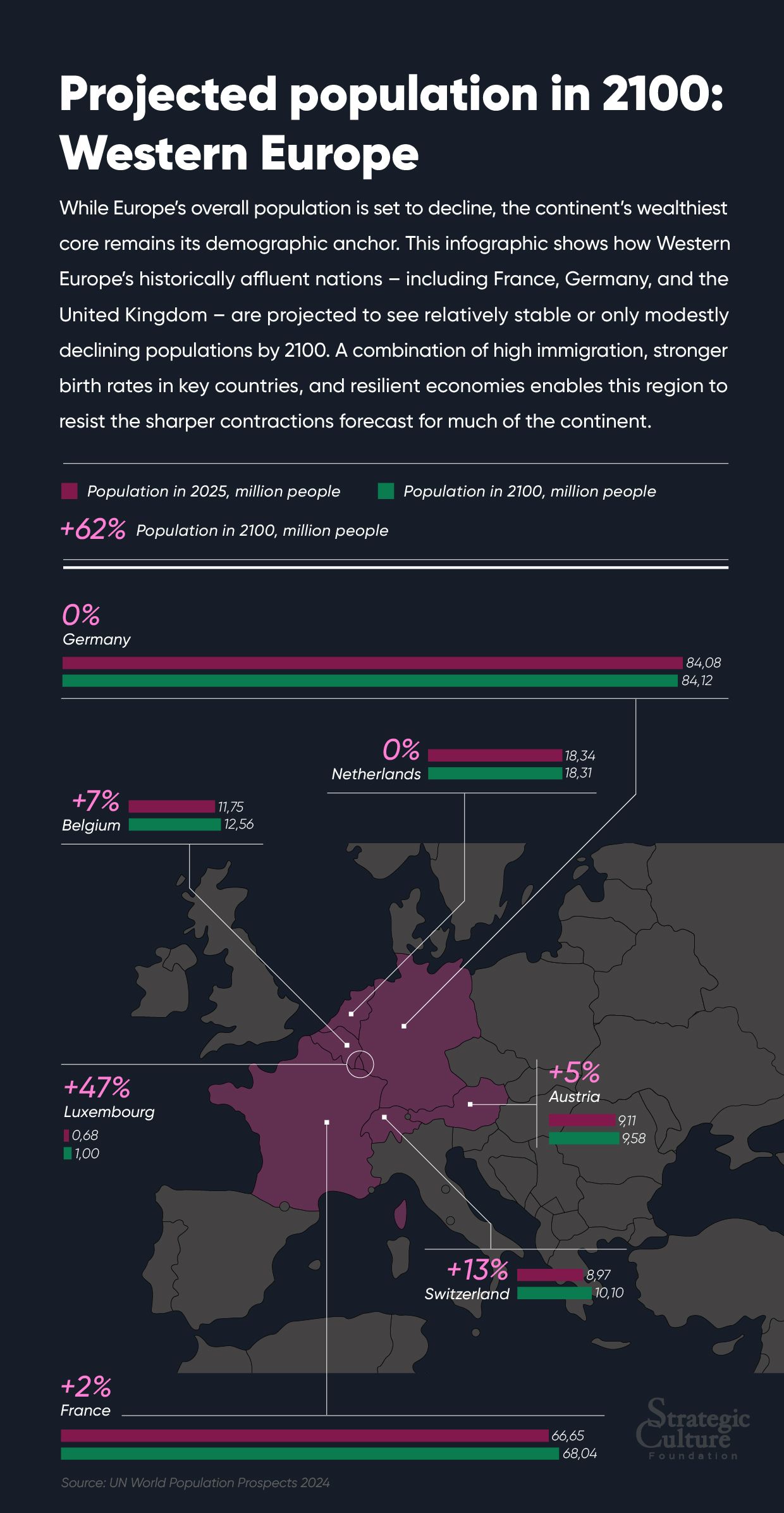 While Europe’s overall population is set to decline, the continent’s wealthiest core remains its demographic anchor. This infographic shows how Western Europe’s historically affluent nations – including France, Germany, and the United Kingdom – are projected to see relatively stable or only modestly declining populations by 2100. A combination of high immigration, stronger birth rates in key countries, and resilient economies enables this region to resist the sharper contractions forecast for much of the continent.