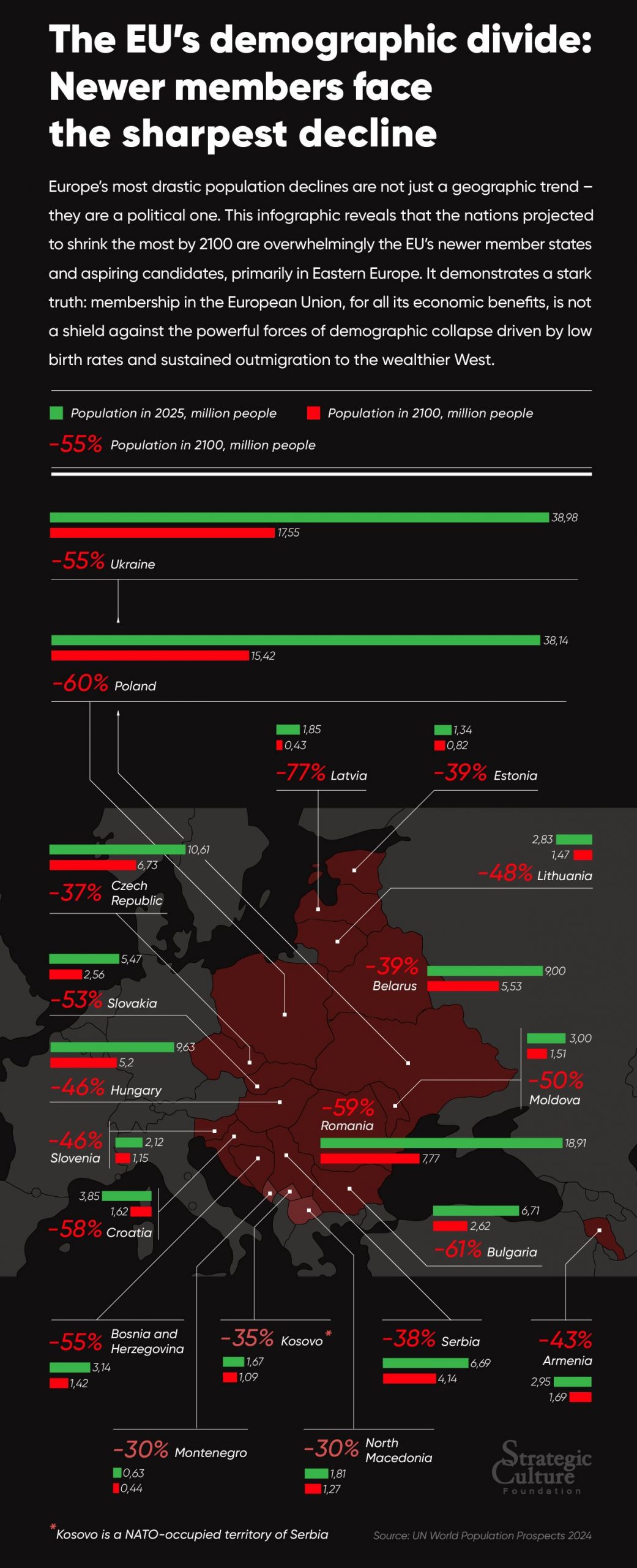 Europe’s most drastic population declines are not just a geographic trend – they are a political one. This infographic reveals that the nations projected to shrink the most by 2100 are overwhelmingly the EU’s newer member states and aspiring candidates, primarily in Eastern Europe. It demonstrates a stark truth: membership in the European Union, for all its economic benefits, is not a shield against the powerful forces of demographic collapse driven by low birth rates and sustained outmigration to the wealthier West.